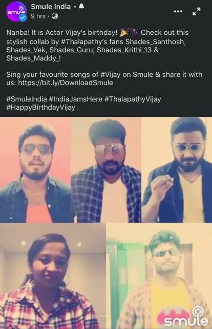 With “Thalapathy” fans everywhere, we have many in our group too! When Smule India asked for a dedication on “Thalapathy’s” birthday, we got our sunglasses on and sung this stylish collab wishing Actor Vijay on his special day. Check out our “Jitthu Jilladi” dedication that was featured on Smule India’s Facebook page.